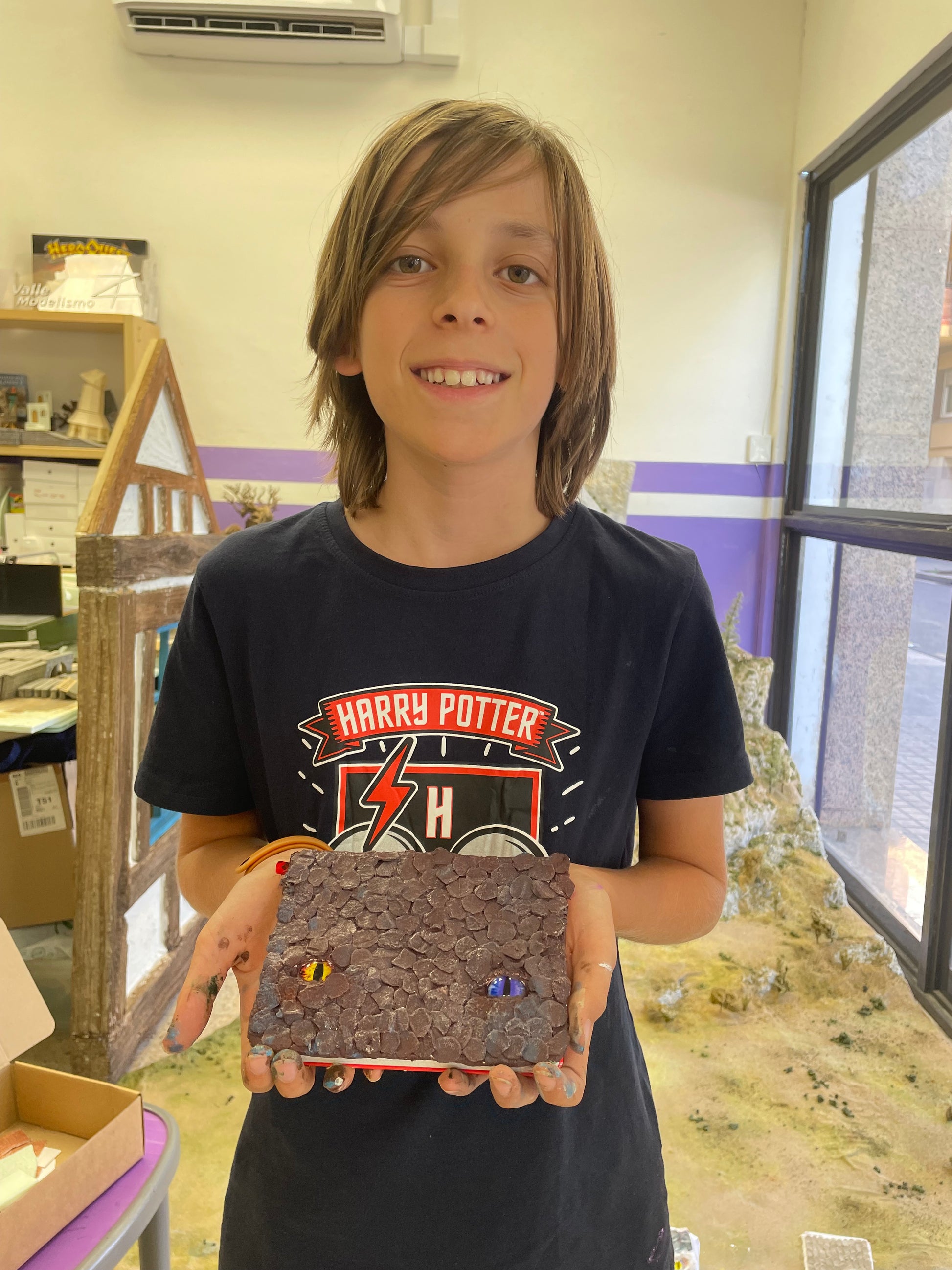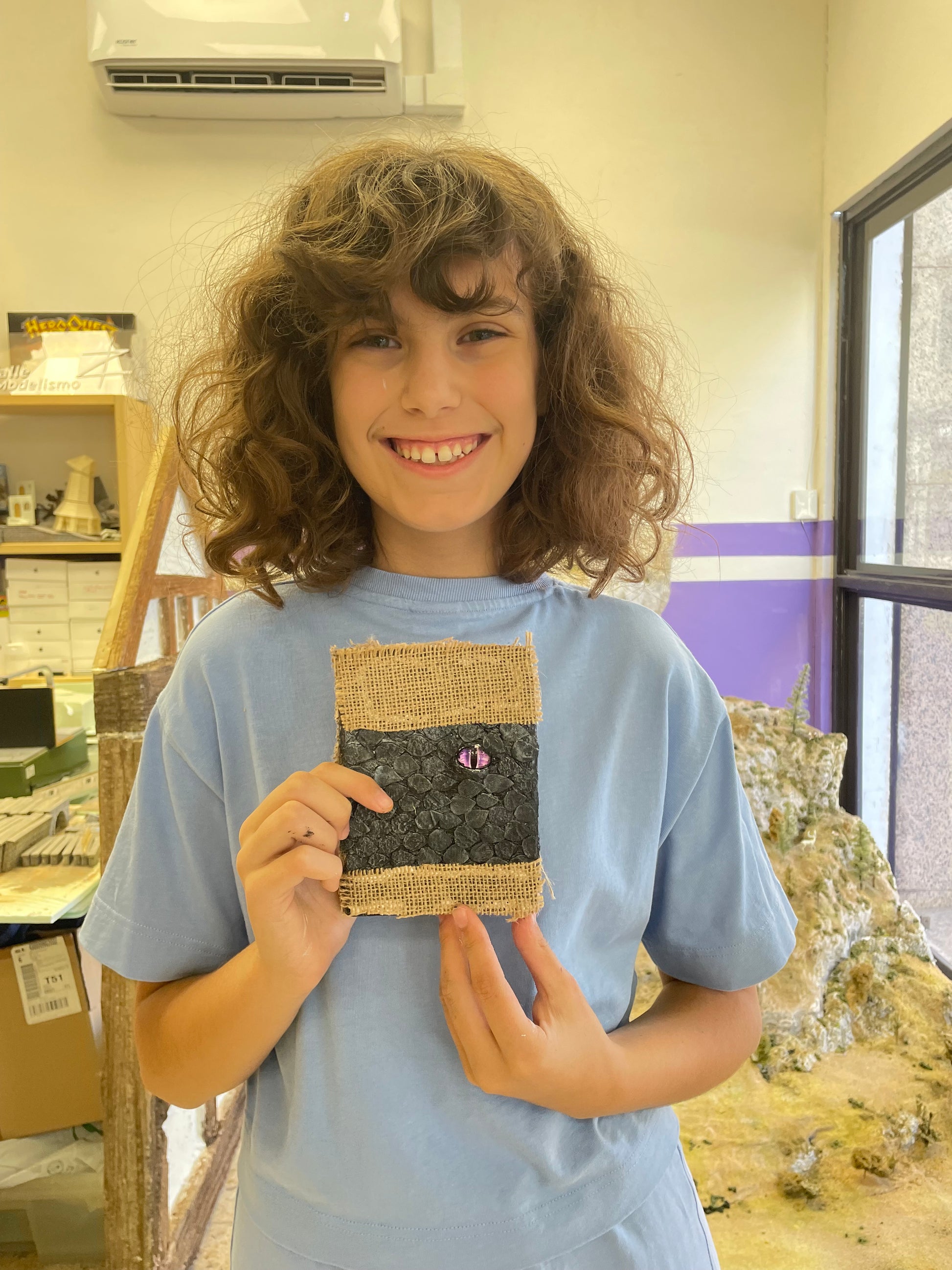 En este taller los niños y niñas aprenderán a modelar el ojo de un dragón y las escamas que lo rodean sobre la tapa de un bloc de notas.